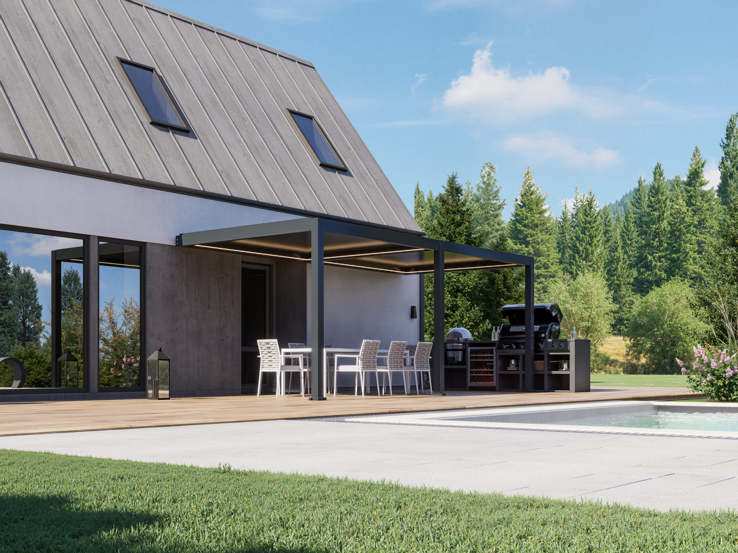 Bioclimatic pergolas Bellano are high-quality pergolas made of powder-coated aluminium and are fully automated. In addition, they can be upgraded with ZIP blinds, glass sliding doors, and ALU fixed or sliding shutters. We also offer a range of accessories such as heaters, fans, and universal rain, wind, and light sensors.