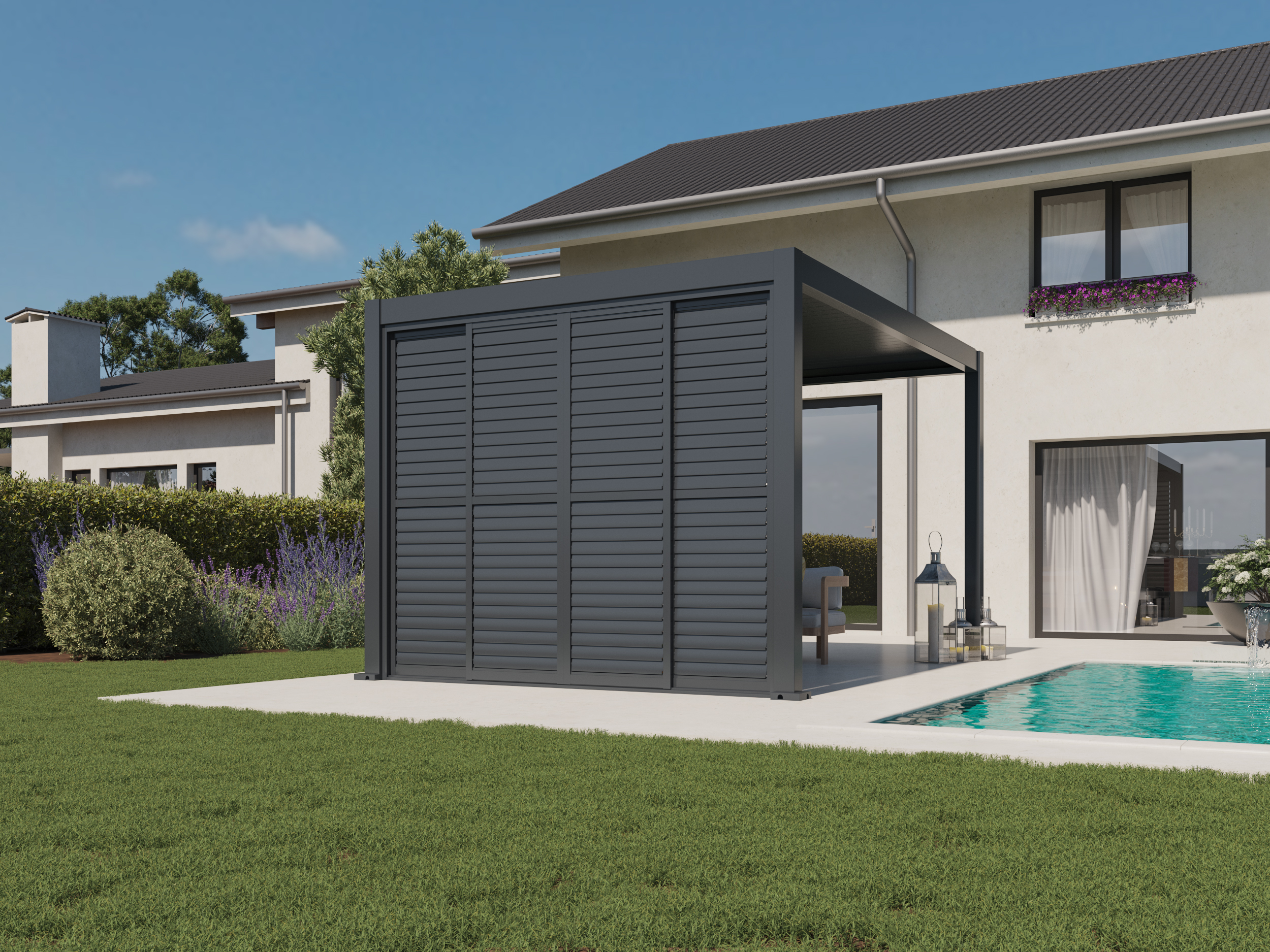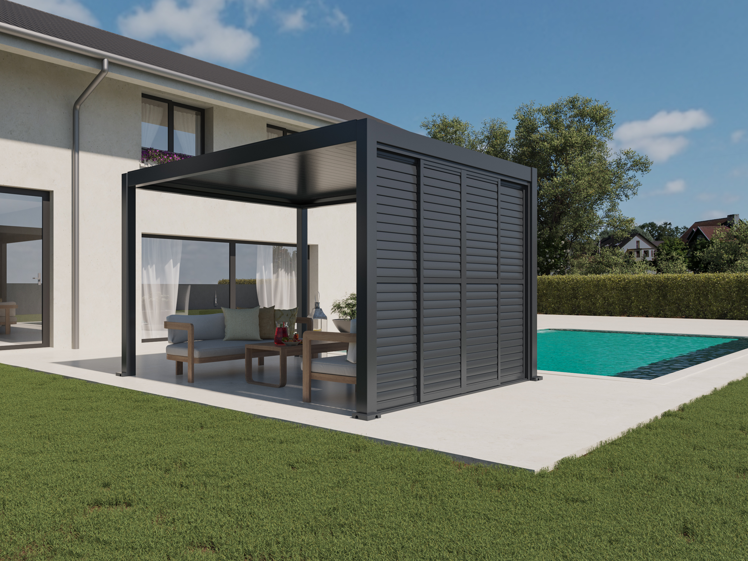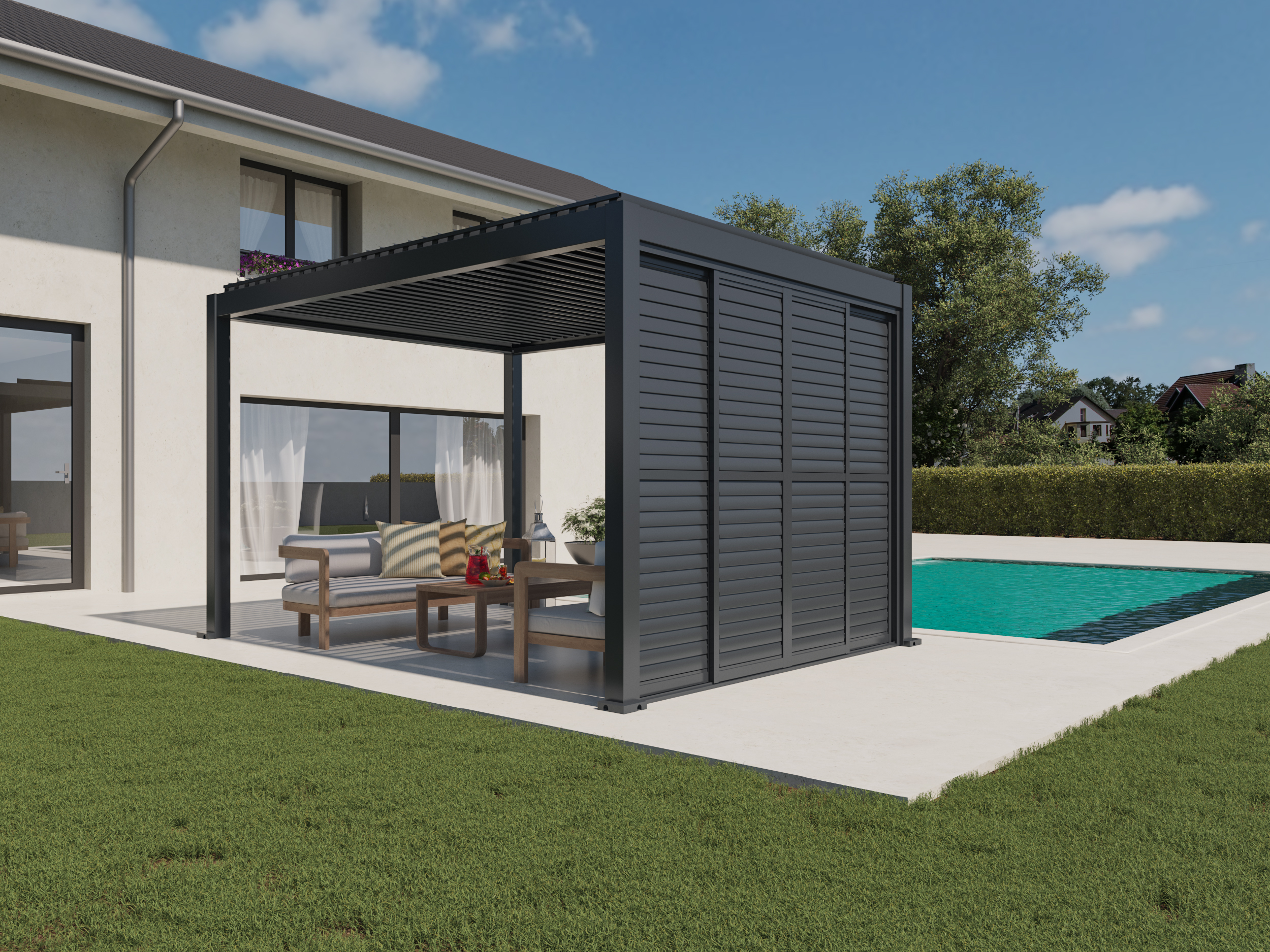 The system enables horizontal sliding of the panels and independent adjustment of the upper and lower slat angles, allowing precise control of light, privacy, and airflow – at any time and in all weather conditions. Thanks to its elegant design and premium materials, the sliding wall is a perfect choice for modern pergolas and outdoor spaces.