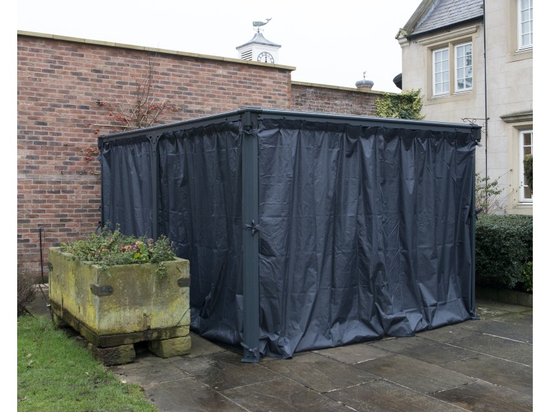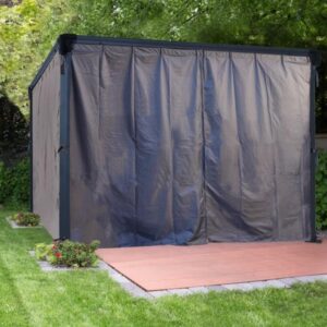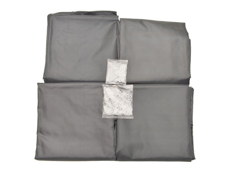 Komplet zaves je estetsko prijeten in funkcionalen. Omogoča vam zasebnost, ki jo iščete in cenite. Zasnovan je tako, da je združljiv z vašo strukturo paviljona. Zavese imajo kavlje, ki nato zdrsnejo v obešala vašega paviljona. Ta komplet vsebuje štiri zavese, ki bodo pokrivale celoten paviljon. Enostaven za namestitev in enostaven za uporabo. Ta komplet vključuje zadrge za povezavo zaves in zadrge za pritrditev na vogalne stebre. Vzdrževanje ni potrebno, preprosto jih lahko operete v stroju. Iz močnega poliestra, nepremočljive in lahke.