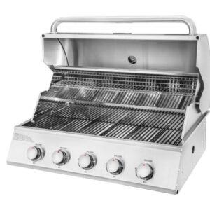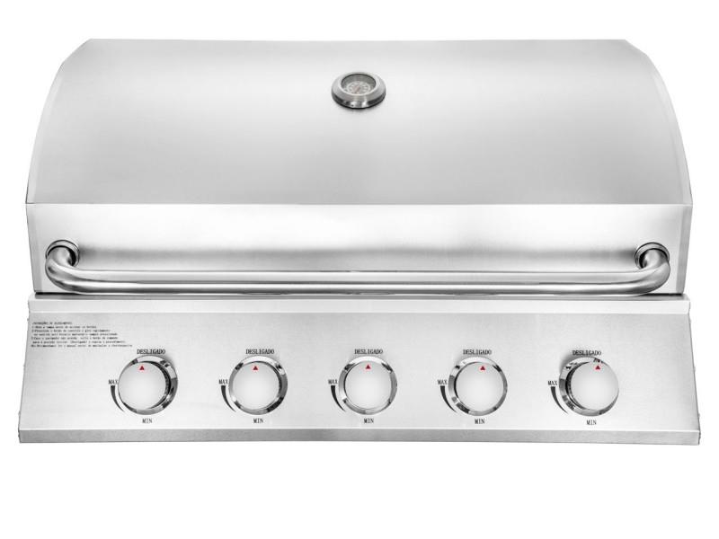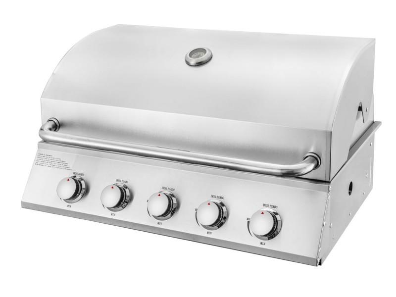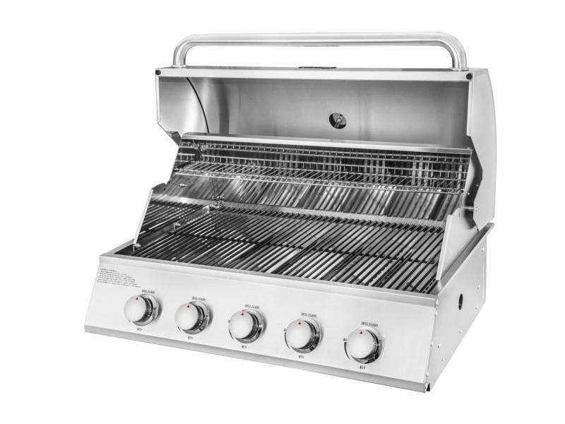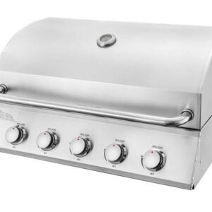 Vgradni žar iz nerjavečega jekla s 5 gorilniki Visokozmogljiv vgradni žar s 5 gorilniki (50.000 BTU), veliko kuhalno površino (810 x 500 mm) in elektronskim vžigom. Narejen iz nerjavečega jekla, z vgrajenim merilnikom temperature in porcelanastimi rešetkami za popolno peko.